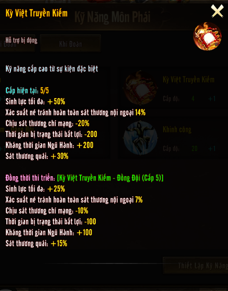 SKILL <Kỳ Việt Truyền Kiếm> Level 5 ![]() | Hiệu quả bản thân Sinh Lực 50% Xác Xuất Tránh Công Nội Ngoại 14% Giảm sát thương chí mạng 20% Giảm thời gian bị trạng thái bất lợi -200 Giảm thời gian bị trạng thái ngũ hành -200 sát thương quái 30% Hiệu quả đồng đội Sinh Lực 25% Xác Xuất Tránh Công Nội Ngoại 7% Giảm sát thương chí mạng 10% Giảm thời gian bị trạng thái bất lợi -100 Giảm thời gian bị trạng thái ngũ hành -100 sát thương quái 15% |